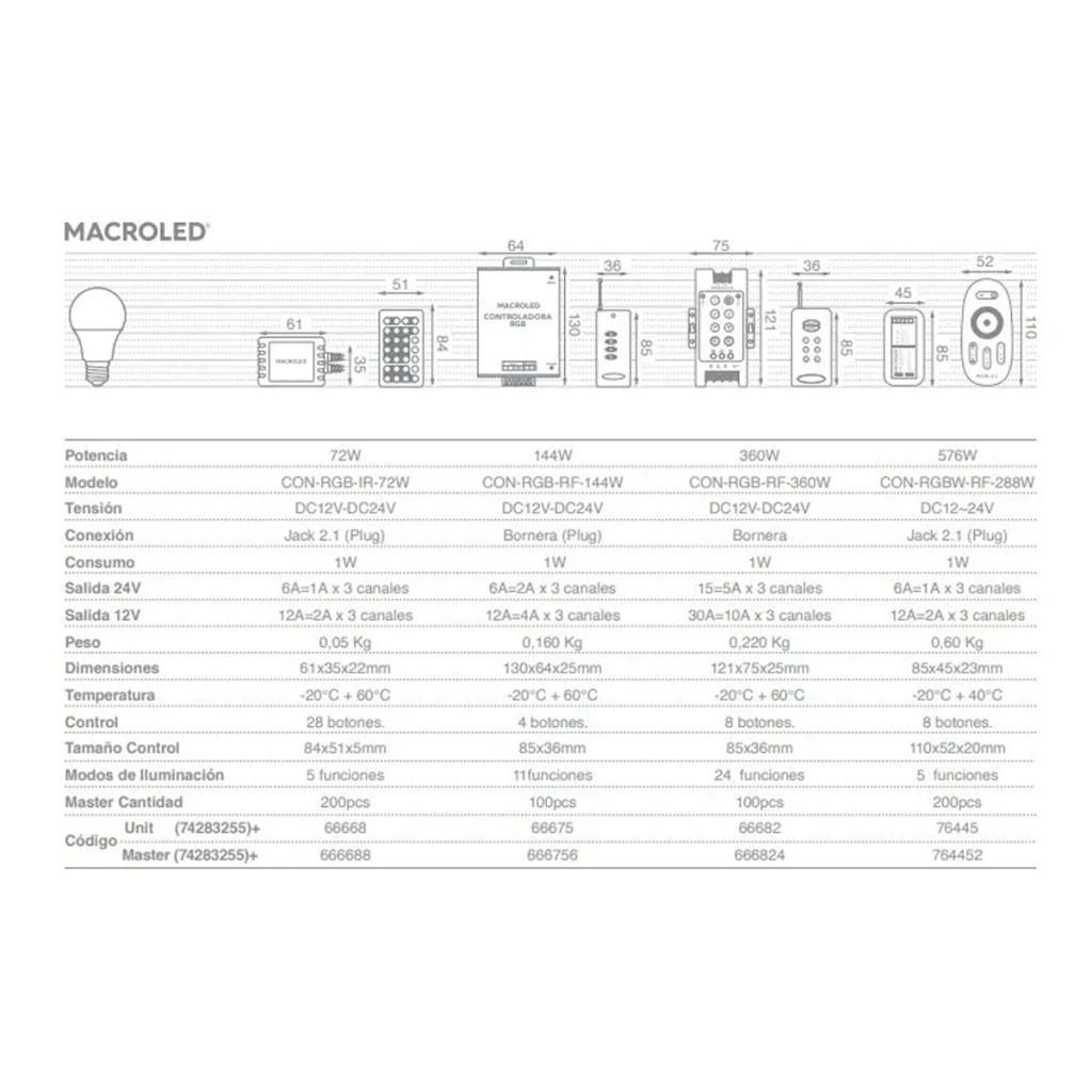 Controlador RGB con Control Remoto Macroled 12-24V 360W - Modelo CON-RGB-RF-360W