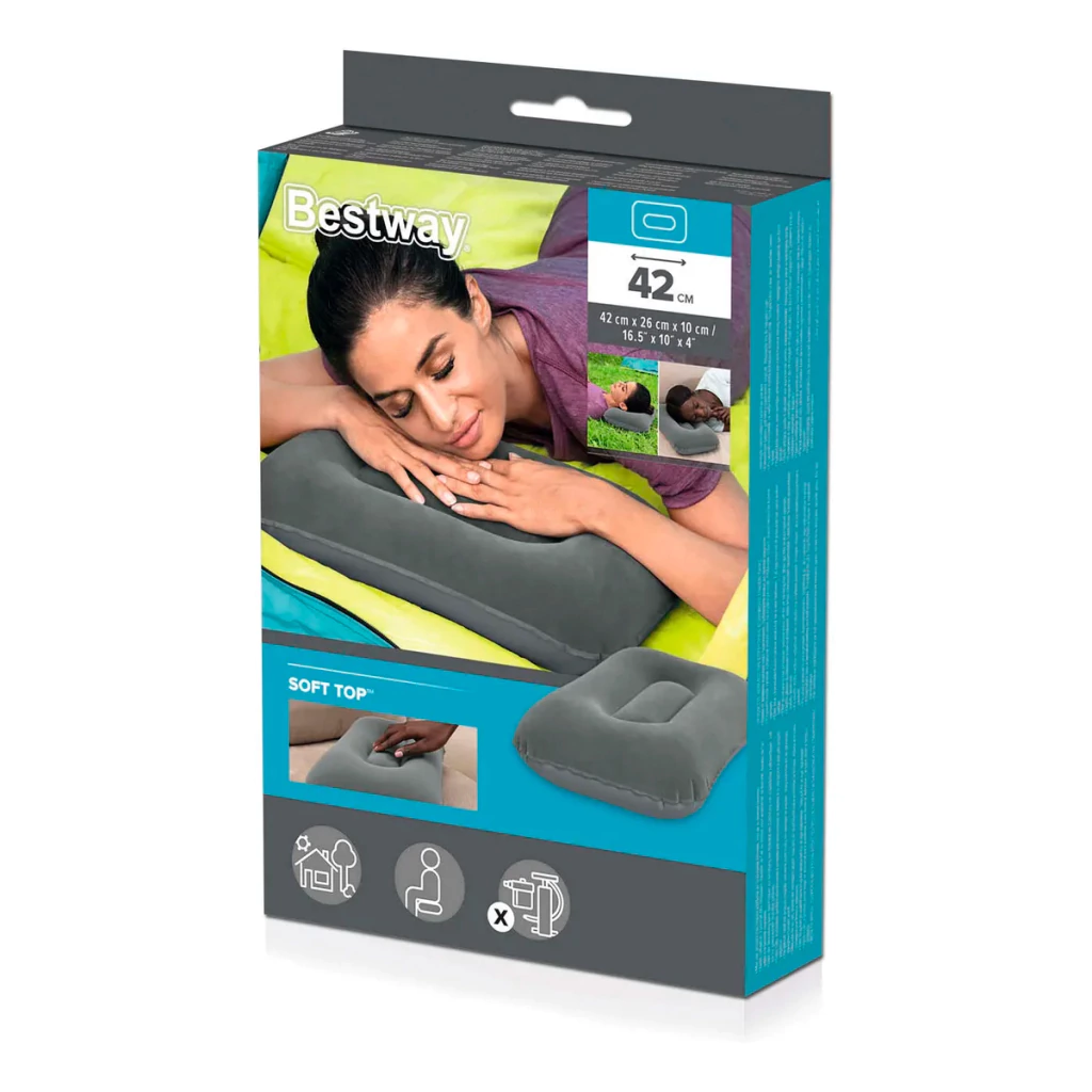 Esta almohada es fácil de inflar y desinflar, lo que permite un rápido armado y guardado sin complicaciones. Además, cuenta con medidas compactas de 42cm x 26cm x 10cm, perfectas para acompañarte sin ocupar mucho espacio.