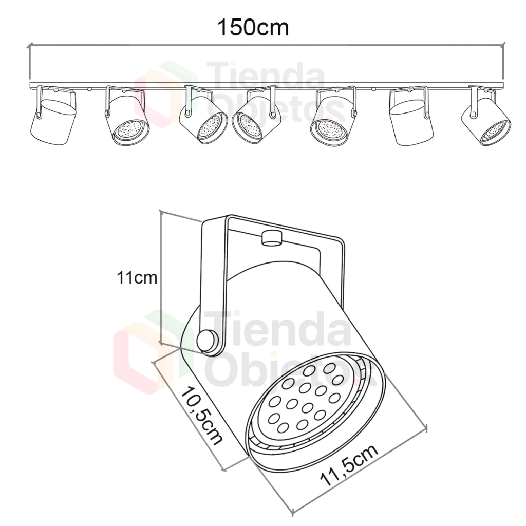 Con medidas de 150 cm de largo, 4 cm de ancho y 1,5 cm de alto para el listón, y cabezales de 10 cm por 11,5 cm, este riel permite una fácil instalación en techos. Además, los spots son móviles, facilitando la orientación de la luz para destacar áreas específicas.